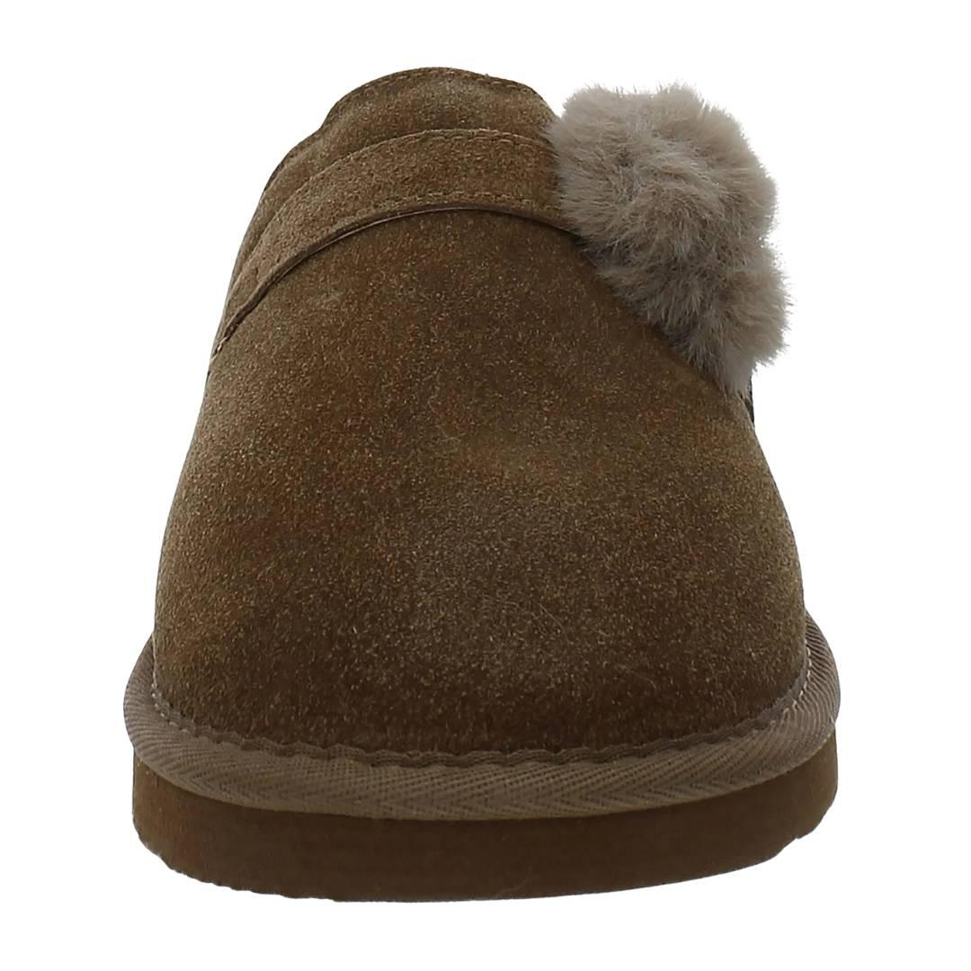 The Bearpaw Women's Ryleigh Slippers redefine cozy comfort for indoor and light outdoor wear. Crafted with a plush wool blend lining and soft suede upper, these slippers offer a luxuriously soft feel, keeping your feet warm and comfortable during chilly days. The classic slip-on design ensures easy wearability, perfect for quick trips outside or relaxing at home.