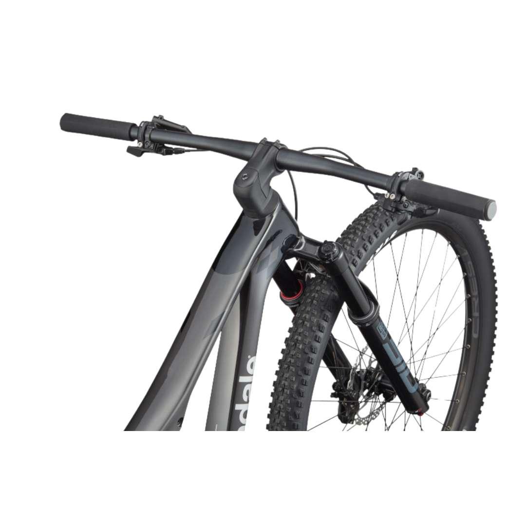 The Cannondale 2024 Scalpel Carbon 4 Mountain Bike - Smoke Black is a high-performance cross-country mountain bike designed for racing and aggressive trail riding. It features a lightweight carbon fiber frame with Cannondale's signature aggressive geometry for maximum efficiency and control on challenging terrain.