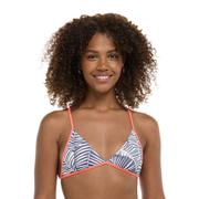 The Eidon Desert Island Mila Bikini Top is a fixed-triangle staple reimagined for everyday comfort and playful versatility. Crafted from a soft blend of recycled nylon and spandex, it features removable soft cups and a two-way adjustable back tie that lets you tailor the fit—ideal for active surf days or relaxed beach mornings. Its reversible design—denim-blue palm print on one side, “flamingo pink” on the other—offers two looks in one piece, perfect for switching things up with ease.