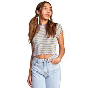 The RVCA Classmate Crop Tee is your new best friend. This women's short sleeve t-shirt is made of a ribbed viscose knit for a supremely soft and comfortable feel. The cropped fit is styled with baby merrow ruffles at the hem for a touch of femininity. Whether you opt for stripes or solids, this tee will quickly become one of your go-tos.