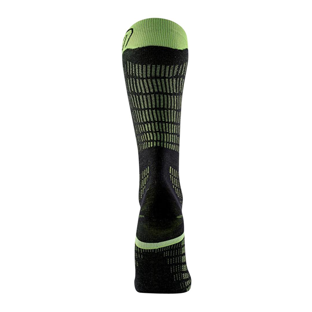Embracing an EcoTech design, these socks incorporate organic merino wool and recycled polyamide with recycled fibers, while the Compressive Tension technology aids blood circulation and muscle stabilization, leading to better recovery, reduced muscle vibration, and enhanced performance. With top-notch precision in knitting, thickness, and tension, and a minimal thickness for improved boot contact, these socks provide optimal stability and transmission. The silicone grip strip ensures unwavering contact with insoles and ski boots, and the merino wool offers warmth and moisture-wicking for breathable comfort. Elevate your skiing to the next level with Ski Ultrafit socks, where precision, performance, and comfort converge.