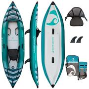 Weighing just 22.4 lbs and packing down to a compact size of 17.7" x 10.6" x 27.5", the Hybris 105 is easy to transport and store. It comes equipped with an adjustable high-back seat featuring an inflatable cushion for personalized comfort, two fins for enhanced tracking, and a 600D polyester carrying bag for convenience. The kayak's triple air chamber safety system adds an extra layer of security, making it an ideal choice for both beginners and seasoned paddlers.